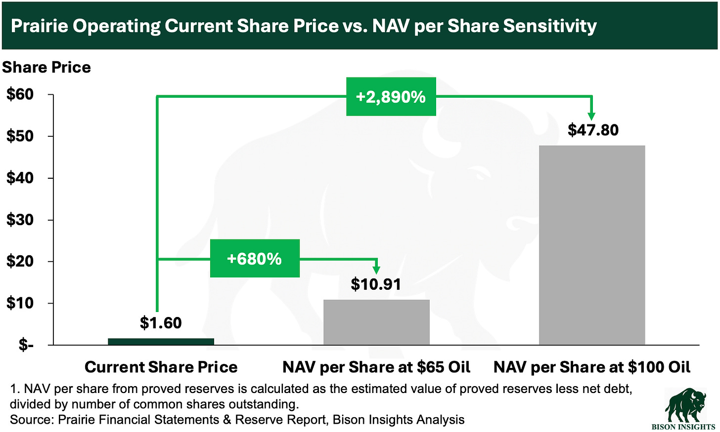 The setup is highly asymmetric. It’s worth noting that if Prairie fails to refinance its Series F preferred, the equity has already fallen so far that even with heavy dilution, the per-share NAV would still be above the current trading price. However, I treat that as a “bust” and the share price would likely fall further. In a successful refinancing scenario, the stock would likely rerate quickly and could begin a path to 10x or more if oil prices remain elevated.