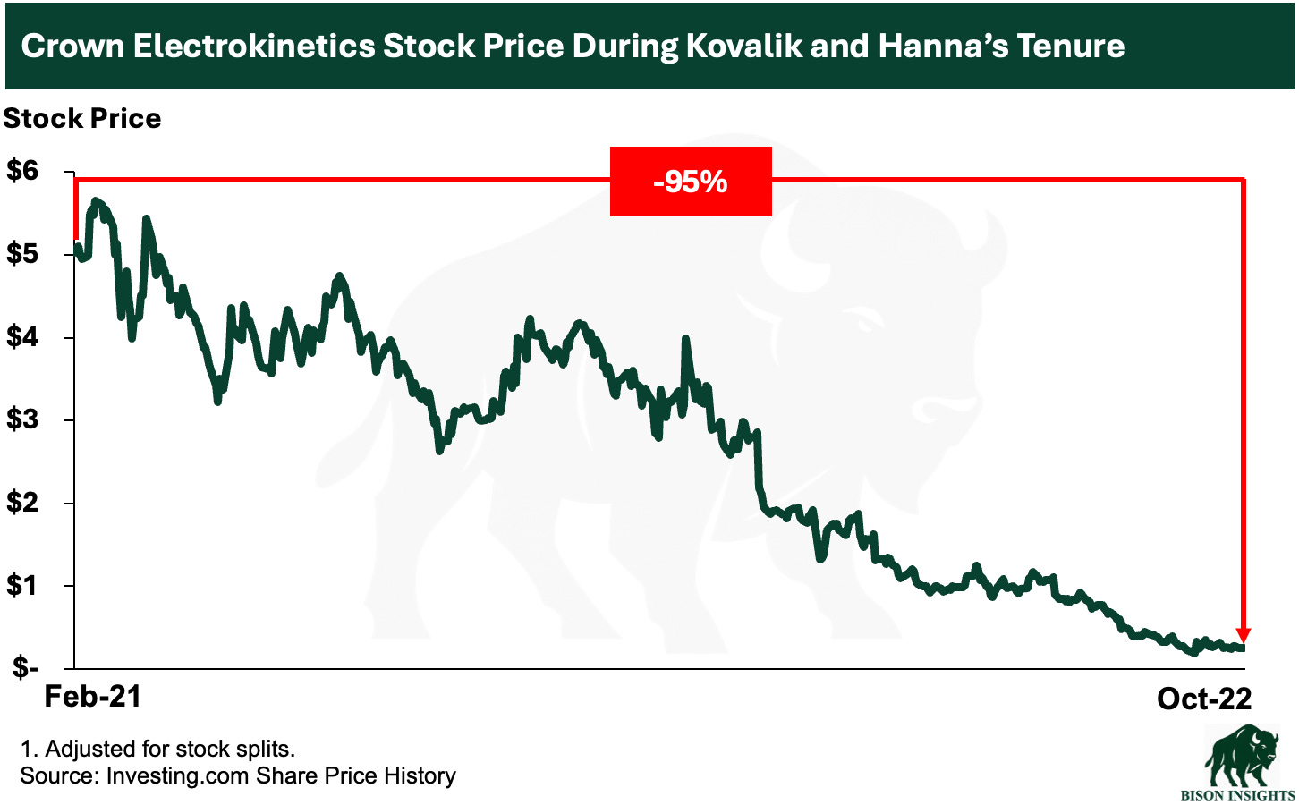 2) After Rosehill, and just prior to Prairie Operating, the two were again involved together at Crown Electrokinetics, a smart glass technology company, from February 2021 to October 2022 where Kovalik served as president and COO and Hanna sat on the board. During their tenure, the two oversaw a 95% decline in the share price of Crown, which was recently delisted from the Nasdaq: