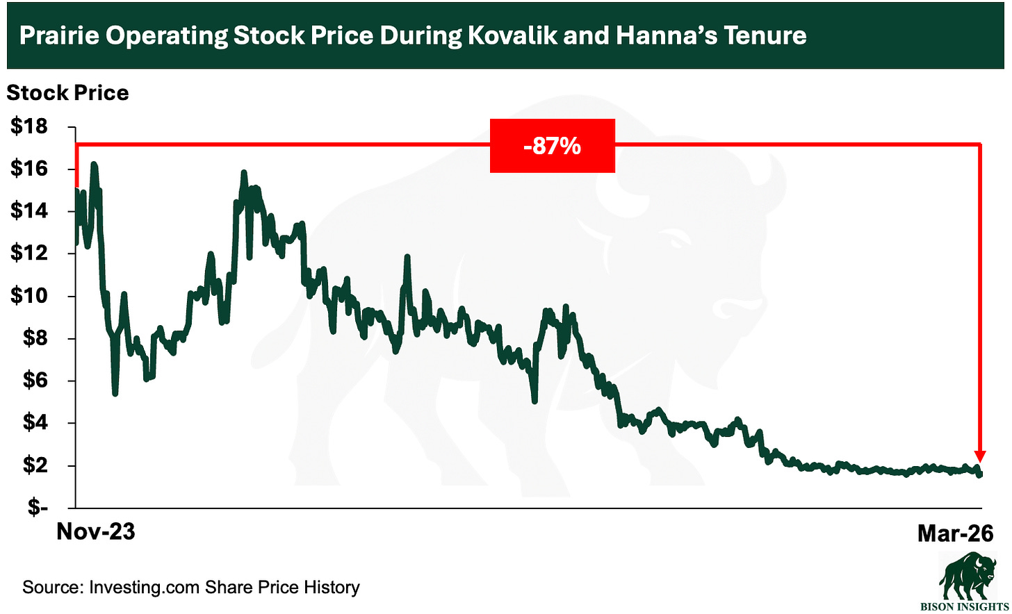 3) Kovalik and Hanna then co-founded Prairie LLC in 2022 and took it public by merging with Creek Road Miners, a public crypto-mining shell. Unfortunately, the third time was not the charm. Here’s how Prairie Operating’s stock performed under their leadership: