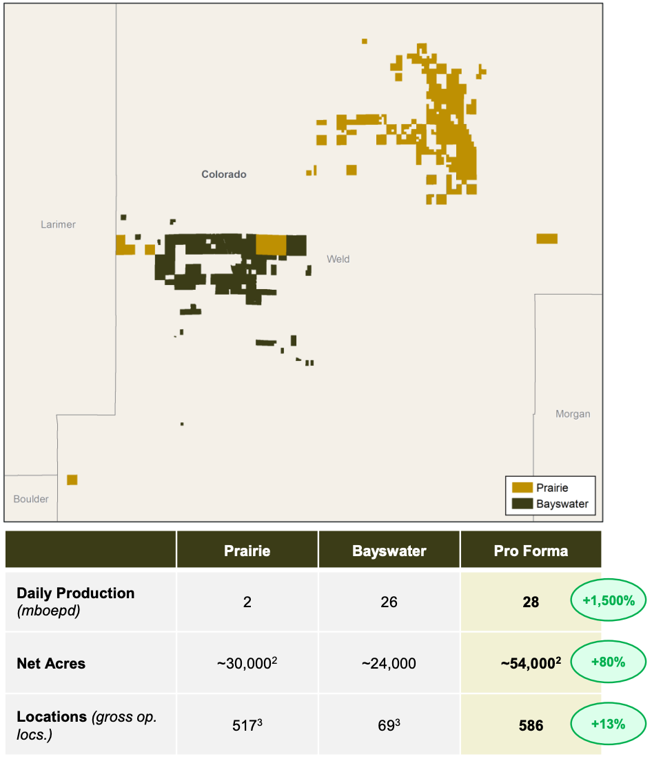 Prairie underwent a transformation with its Bayswater acquisition in early 2025. Bayswater brought Prairie roughly 24,000 net acres in Weld County, Colorado, about 26,000 boe/d of mostly oil-weighted production, and about $1.1 billion of proved PV-10: