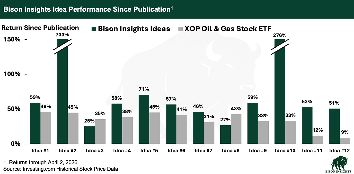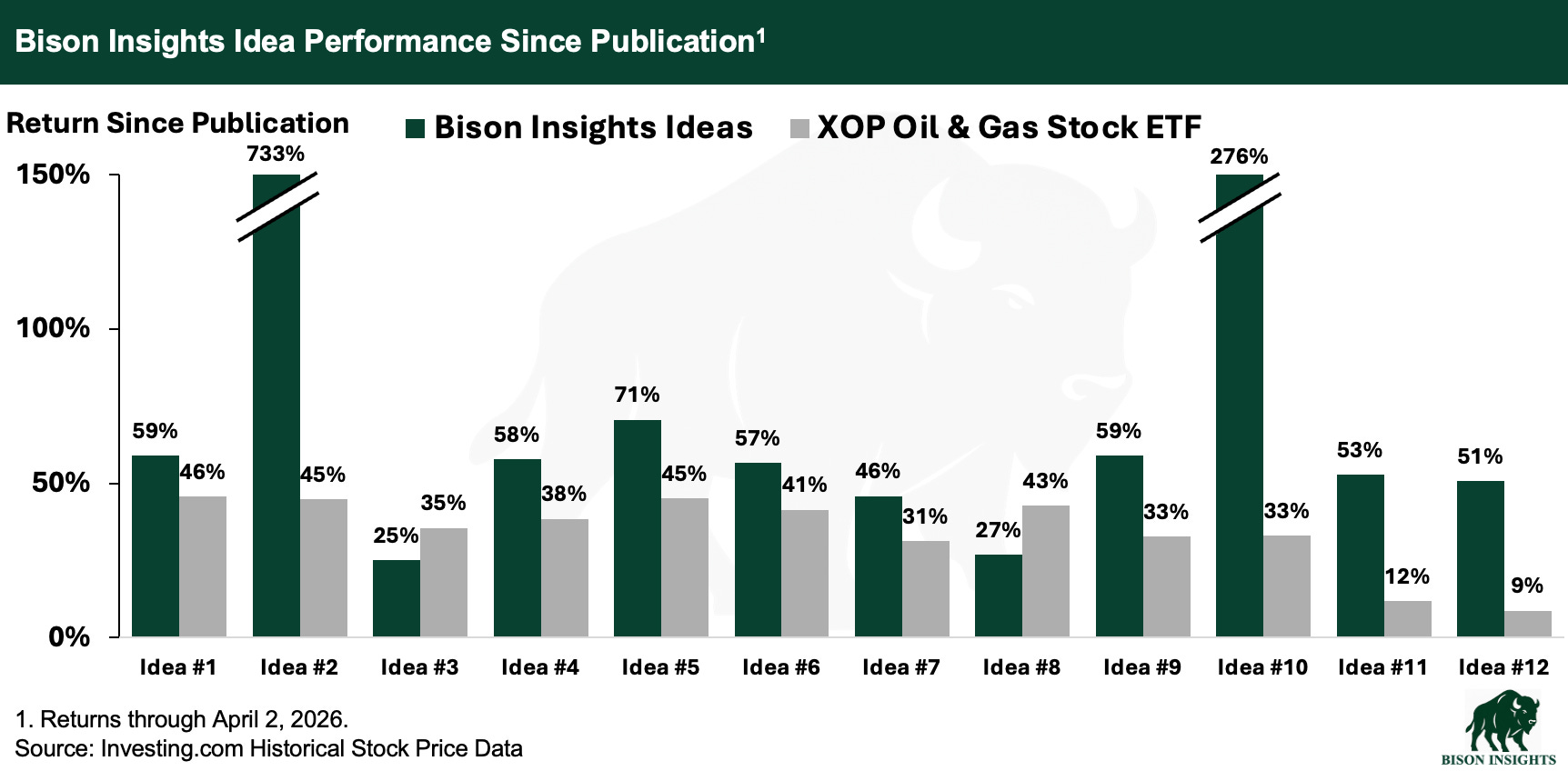 So far, every Bison Insights idea has generated positive returns since publication, and 10 of the 12 have outperformed the energy sector as measured by the XOP Oil & Gas ETF since publication:
