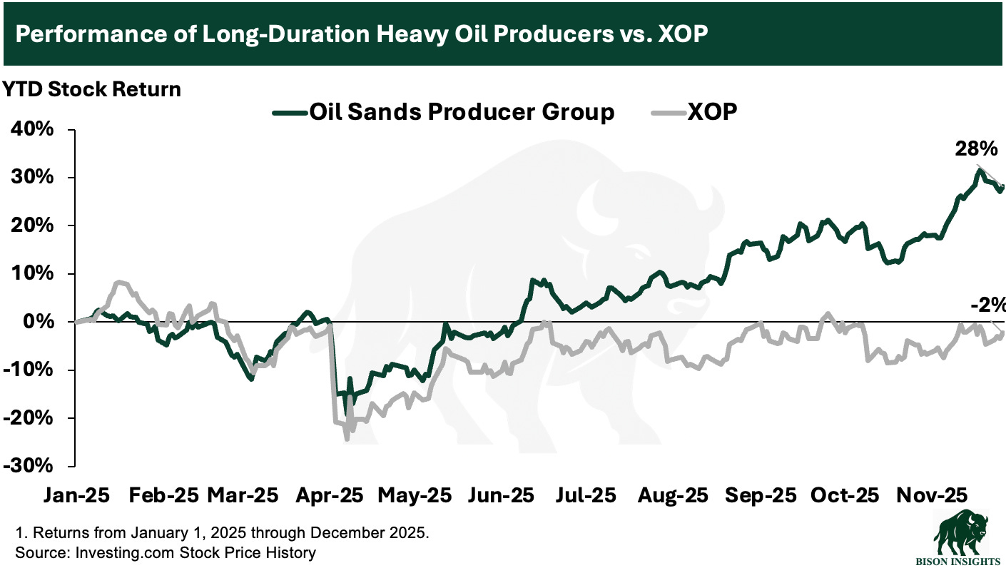 This is why Canada’s oil sands companies have outperformed (along with pipeline access for their products!) These companies often have 20–50 years of reserves and don’t face the steep production declines that U.S. shale producers do. The market has started recognizing how valuable these long-life assets are.
