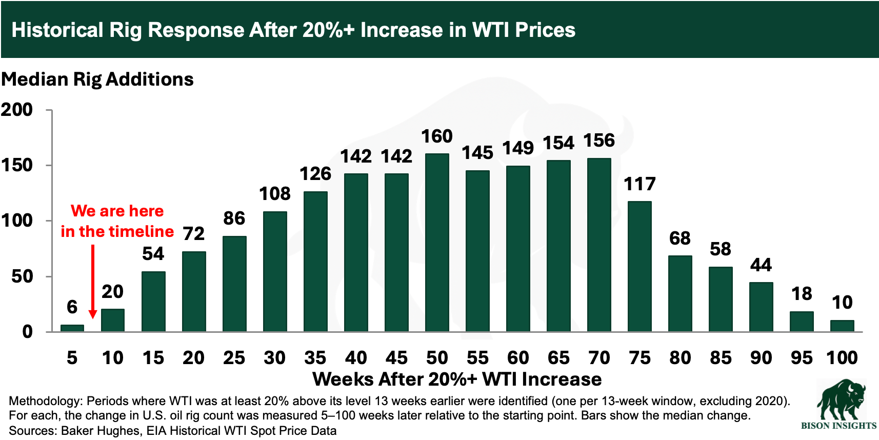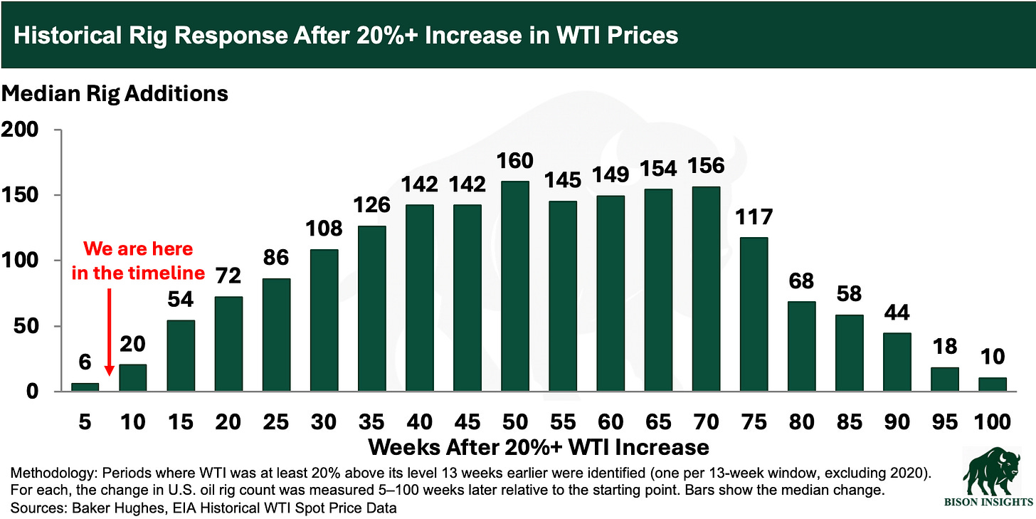 Because there’s usually a lag. Producers first need to approve budget increases and sign contracts, then OFS companies need to assemble crews and move rigs before activity shows up in the rig count. Historically, rig additions build over time after a move higher in WTI, often not peaking until around 40 weeks later. Today, we’re only roughly 8 weeks removed from the Strait of Hormuz crisis and the move higher in oil prices: