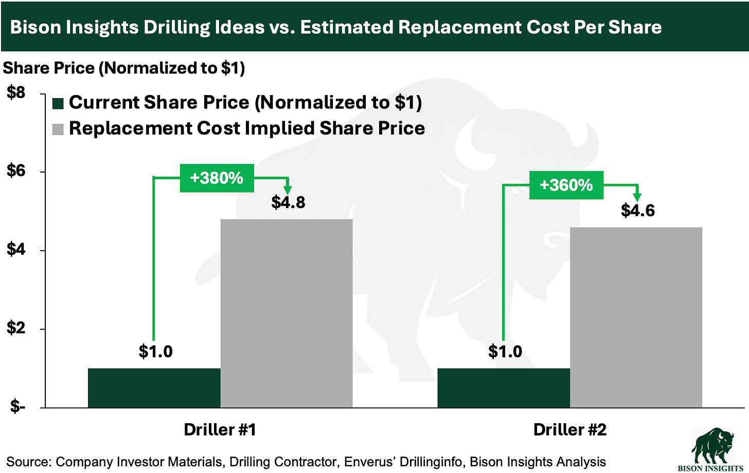 Third, retired oilfield service equipment does not change the fact that E&P companies still need to produce oil. Producers hire OFS companies to drill and complete wells, and if there is not enough capacity to meet demand, then new equipment gets built. That’s why replacement cost is such an important valuation anchor for drilling companies, and why I’ve emphasized it in prior articles. The two Bison Insights drillers I’ve written about still trade far below replacement value estimates:
