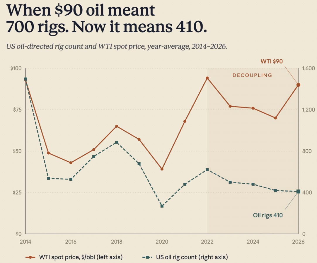 A recent popular article argued that U.S. shale will not respond to higher oil prices the way it did in the past. The article includes a graph titled: “When $90 oil meant 700 rigs. Now it means 410”: