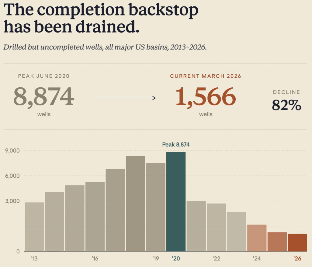 I think this actually cuts against his point. If operators are running low on already-drilled wells, they’ll need to drill more new wells to keep production flat or grow it.