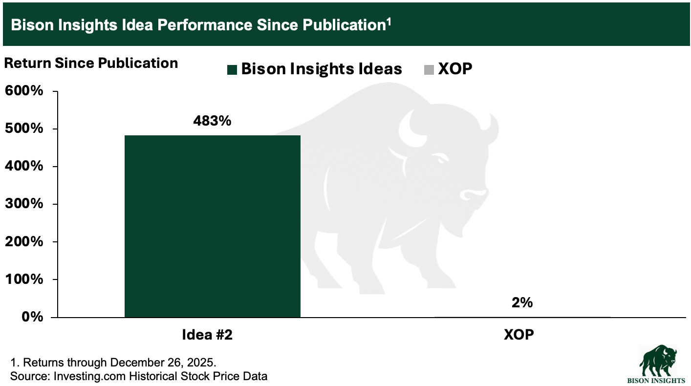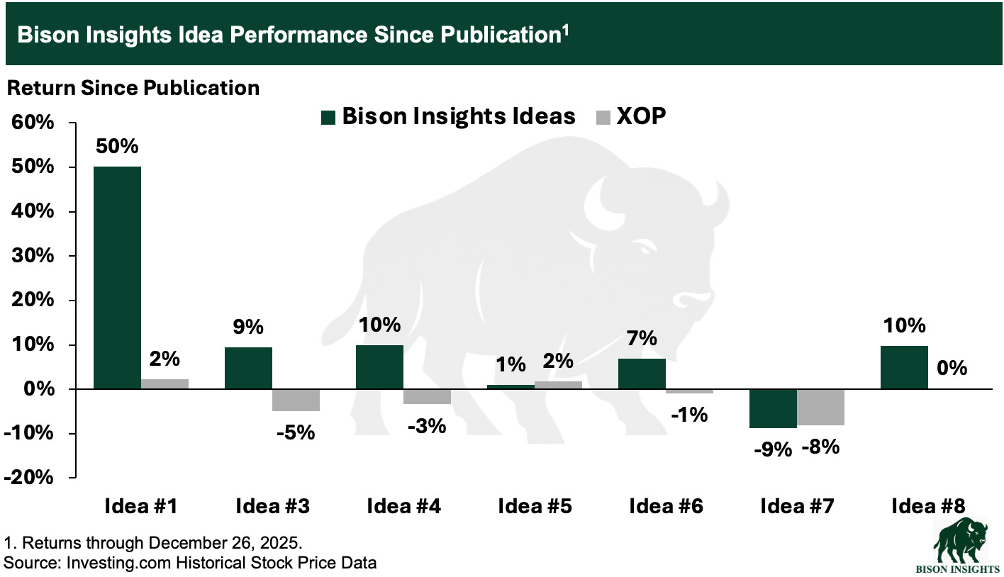 Since launching Bison Insights, I’ve shared eight differentiated oil and gas stock-related ideas. So far, my ideas have performed well relative to the broader energy market (as measured by the Oil & Gas Exploration & Production ETF, XOP), with big outperformance from the winners and only small underperformance from the two losers so far: