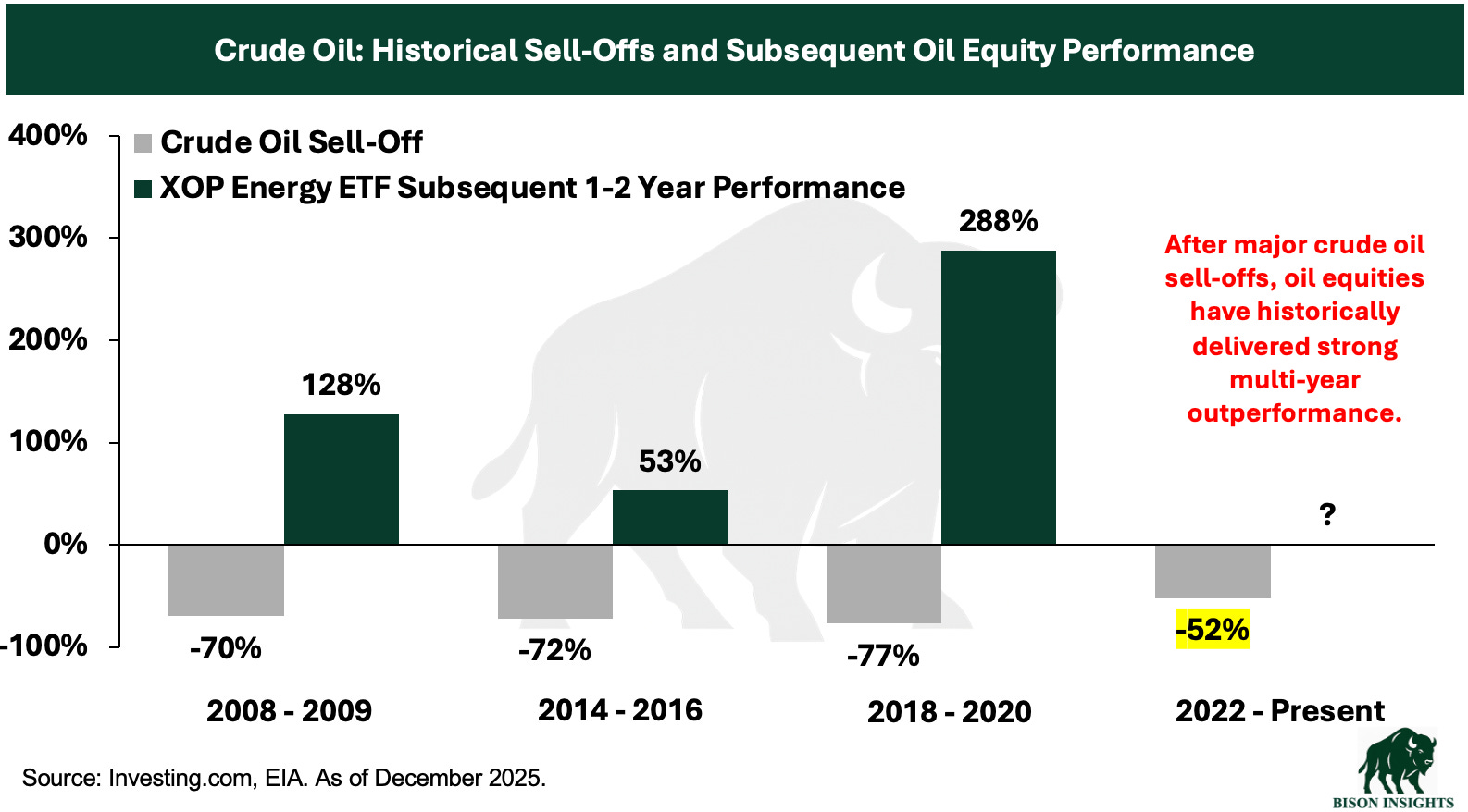 These eight ideas span oil producers, natural gas producers, and oilfield services firms. On the oil side, prices are now near five-year lows. Because the industry is cyclical, periods like this — when prices fall below the marginal cost required to bring on new supply — have historically been some of the best times to invest: