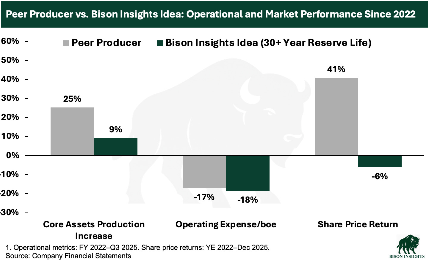 The company I highlighted has roughly 30 years of oil reserves at current production levels. And over the past several years, it has undergone a major operational inflection, delivering record production, steadily declining operating costs, and a meaningful improvement in its second major operating segment. A close peer that achieved a similar combination of production growth and cost reductions saw its share price rerate sharply higher. This company, however, has lagged meaningfully, despite comparable operating progress: