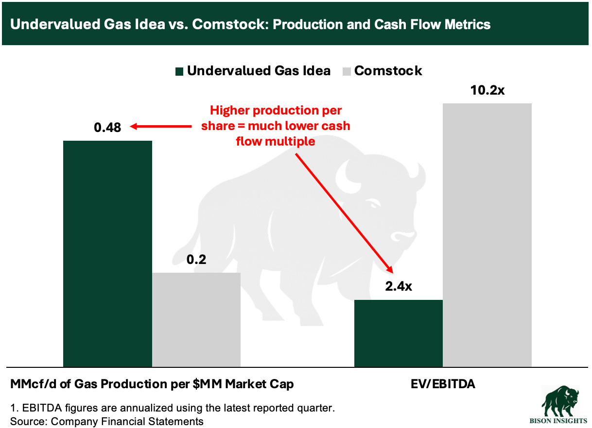 Despite this rise in stock price, this company remains deeply undervalued relative to natural gas peers, particularly Comstock. The chart below shows how much gas production investors in this company receive per dollar invested, alongside an EV/EBITDA comparison with Comstock.