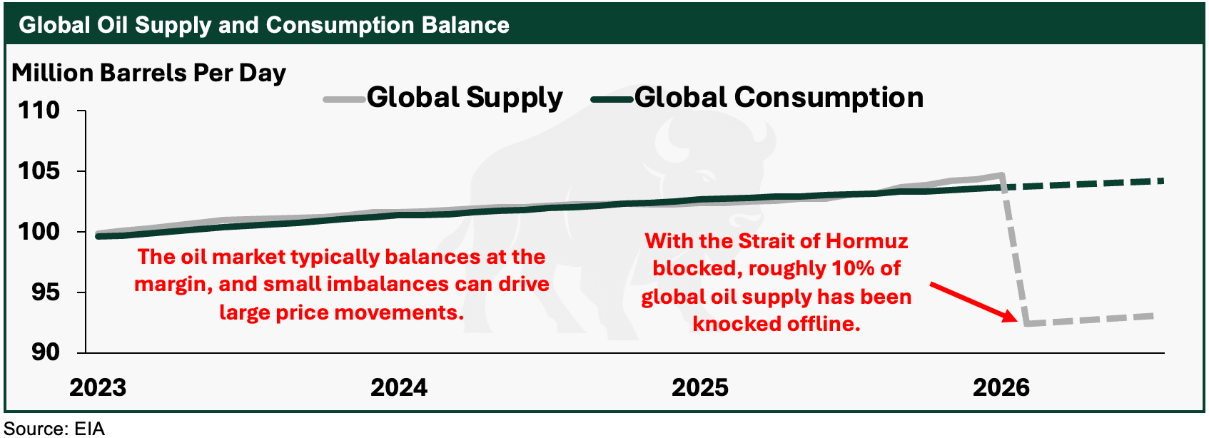 This week marks the third week of the closure of the Strait of Hormuz, which has resulted in the disruption of over 10 million barrels per day of supply to the oil market. This disruption may increase as more Persian Gulf producers shut in production amid rising storage constraints, as Operation Epic Fury continues.