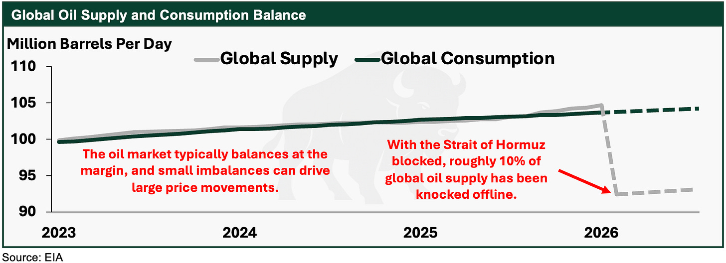 For an oil market that typically balances at the margin, and for which an even 1-2 million barrel per day deficit or surplus has historically caused large price swings, this disruption has accurately been called by the IEA the “largest-ever oil supply disruption” in history.