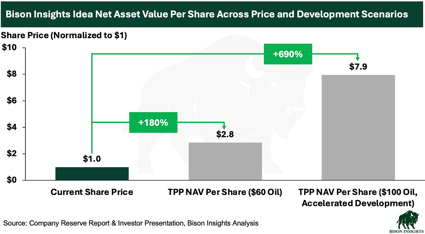 At much lower oil prices, this company trades at a steep discount to its net asset value (NAV) per share, which increases substantially in a higher oil price environment with accelerated development made possible by higher cash flow: