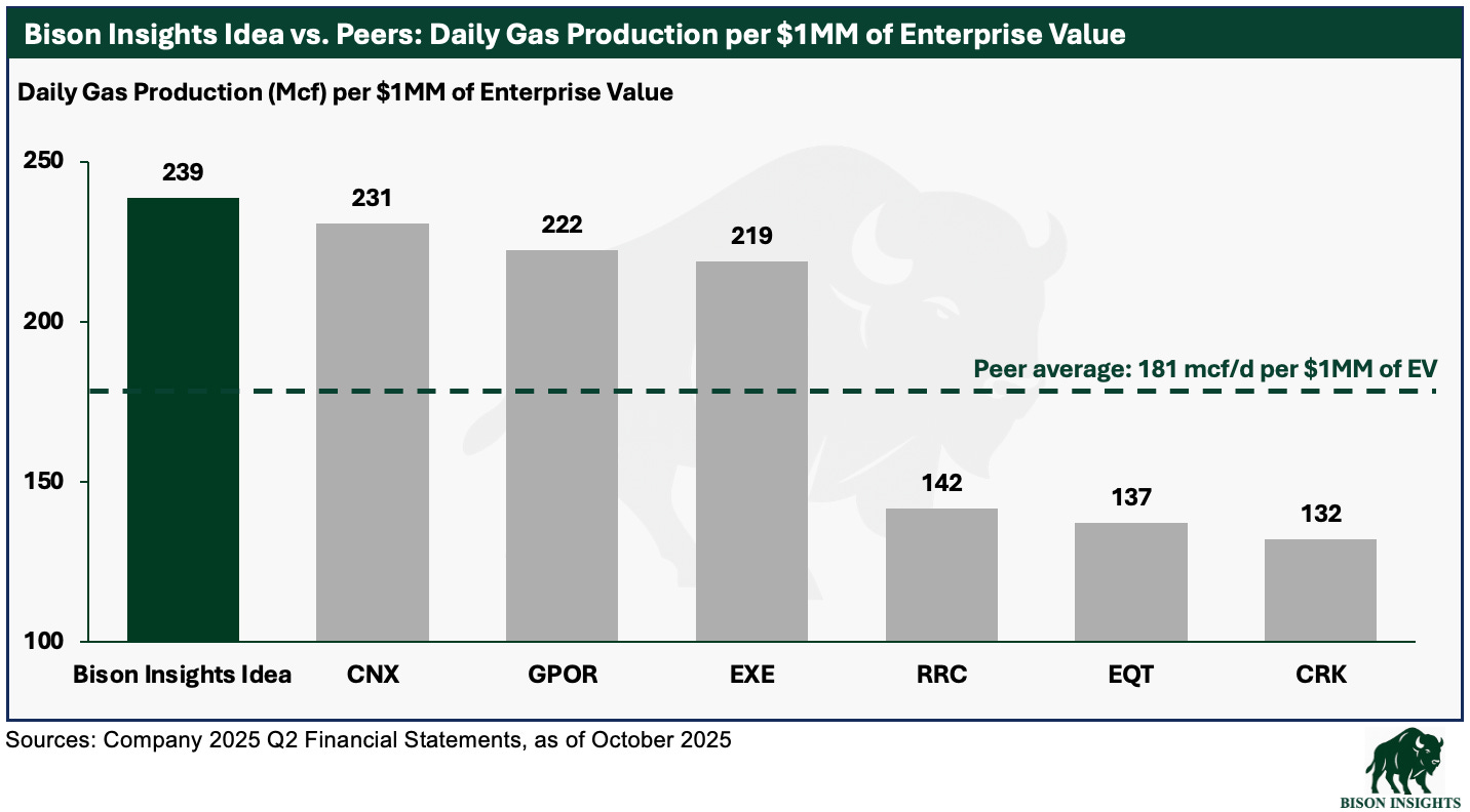 But this chart doesn’t tell the full story - natural gas is only half of this company’s output, with the rest being oil and NGLs. That means investors get more exposure to gas than these larger gas names, while also getting substantial oil and NGL production essentially for free.