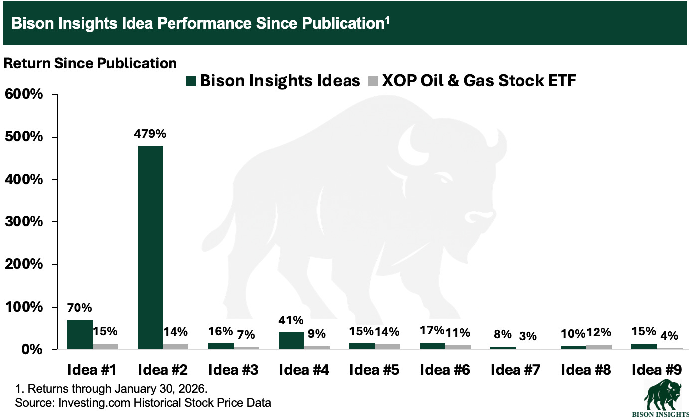 As oil prices have risen over the past week, this company (listed as “Idea #9” in the chart below) has already performed well, outperforming the broader energy index as measured by the XOP ETF since publication, with the other ideas I’ve shared so far here on Bison Insights also performing well: