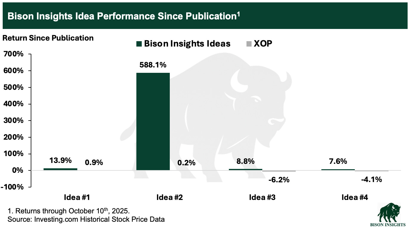 Oil crashed on Friday, down ~5% for the day, as trade war concerns resurfaced. It is timely to share a performance update on the four ideas I’ve written about in the Bison Insights newsletter.