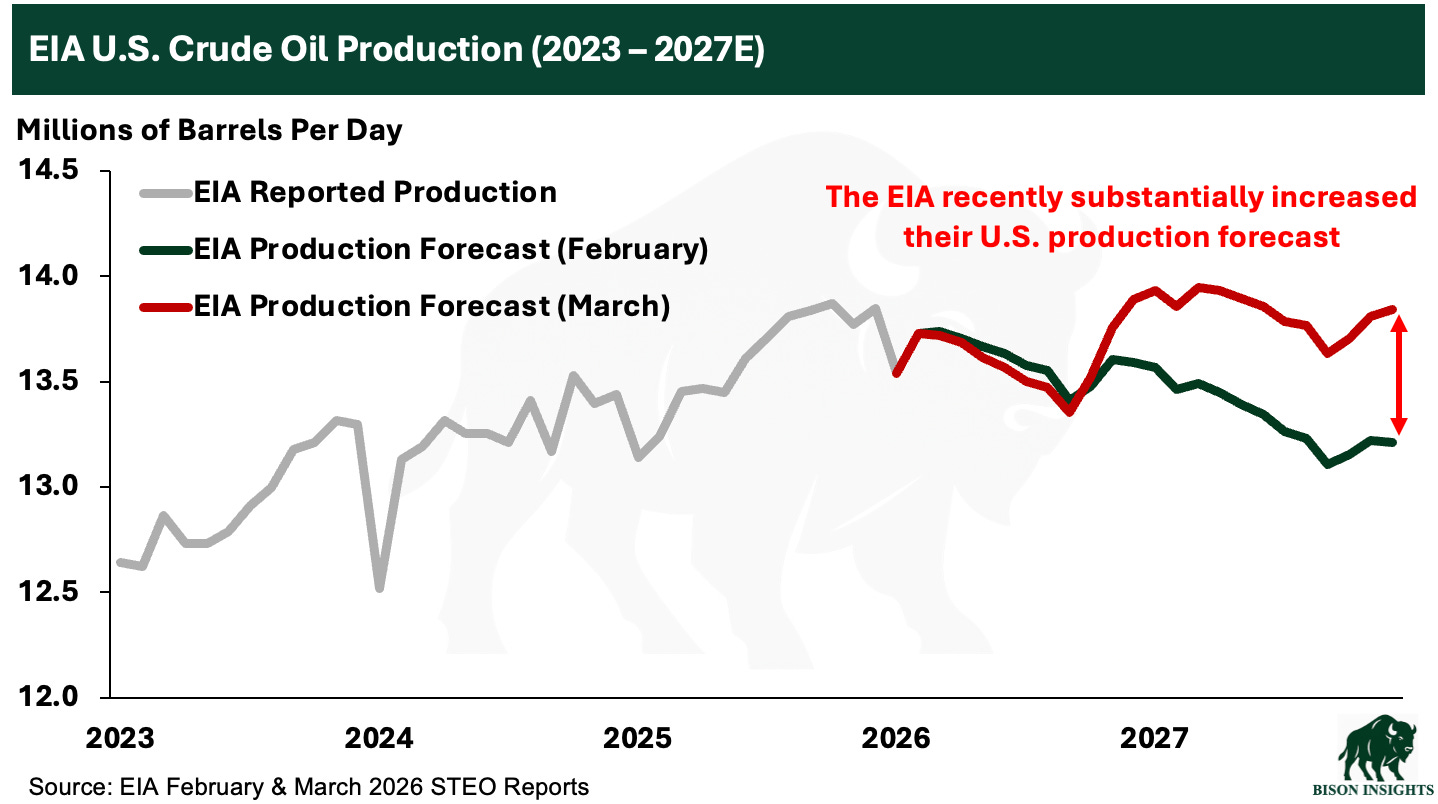 This reduced investment had begun to show up in official supply forecasts. In its February outlook, released before the war, the EIA projected that U.S. oil production would begin to decline. Since then, after the sharp increase in oil prices, the EIA has raised its production outlook: