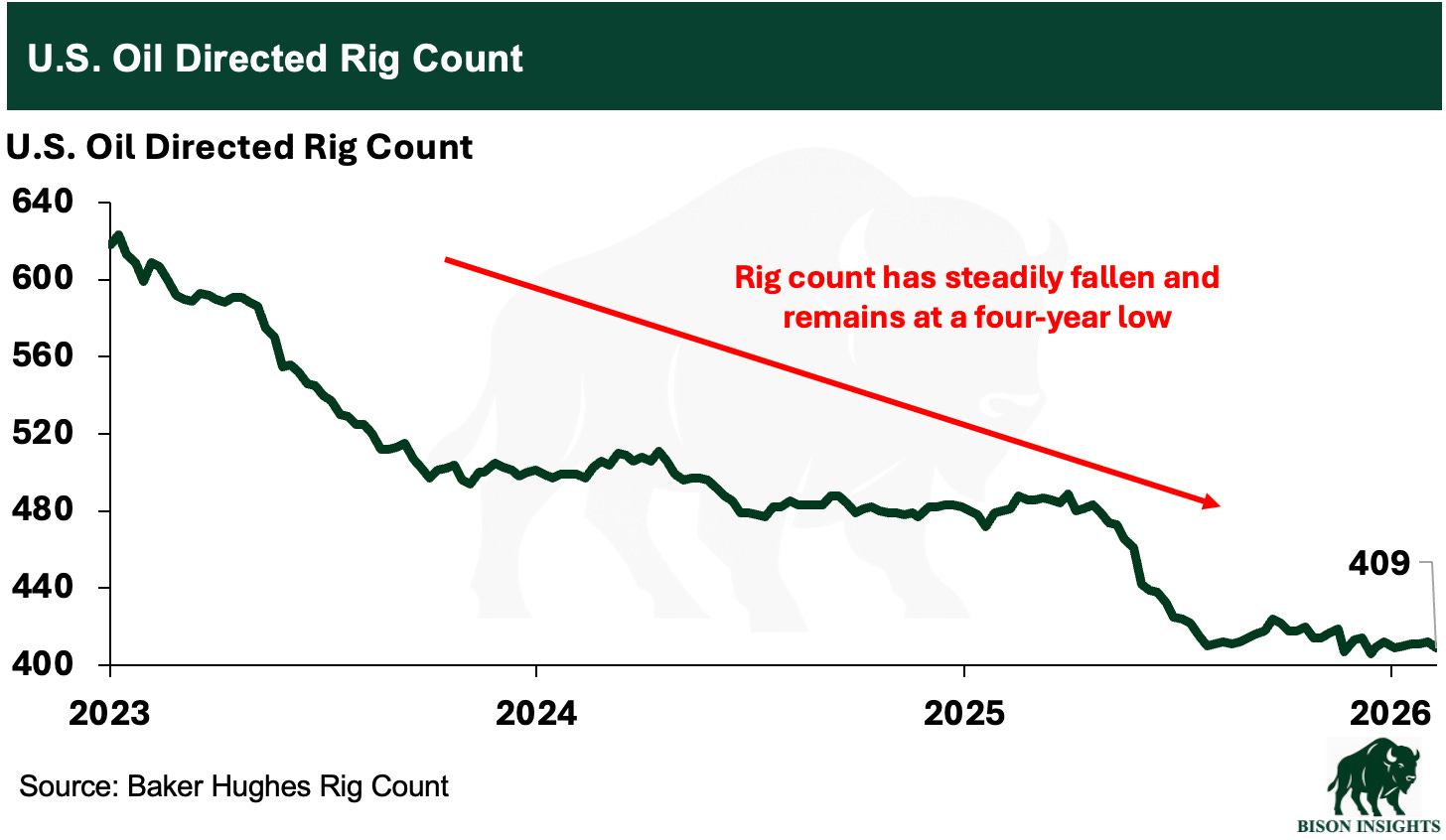 Before the conflict, the oil market was tightening — I originally wrote about that in Oil Geopolitical Risk, Surprising Positive Oil Fundamental Data, Ideas with High Oil Price Upside. I highlighted that oil demand was continuing to grow, but that OPEC spare capacity depletion and several years of lower oil prices had pushed the U.S. rig count steadily lower.