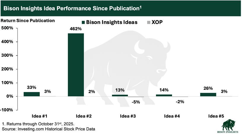 Overall, the medium- to long-term outlook for oil prices looks increasingly constructive. Despite short-term oil and gas price volatility, the ideas I’ve shared here on Bison Insights have performed very well since publication, as I recently highlighted in Oil Price Falls, Bison Insights Ideas Rise.