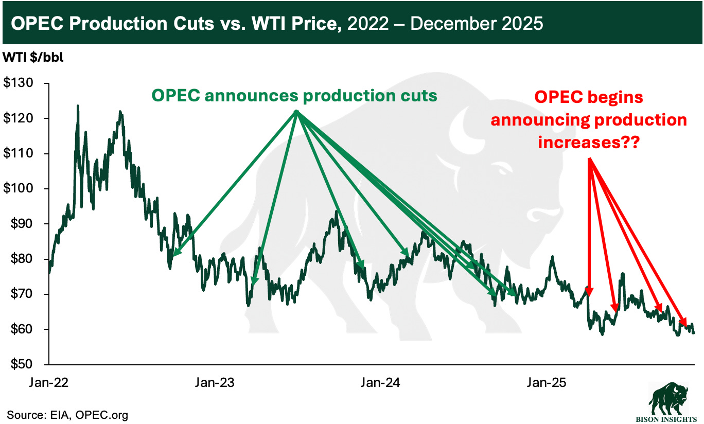 The group clearly benefits from higher prices, and its stated purpose is to “stabilize” oil markets. So why would OPEC+ keep production constrained for several years when prices were much higher, only to increase supply now, when prices are lower?