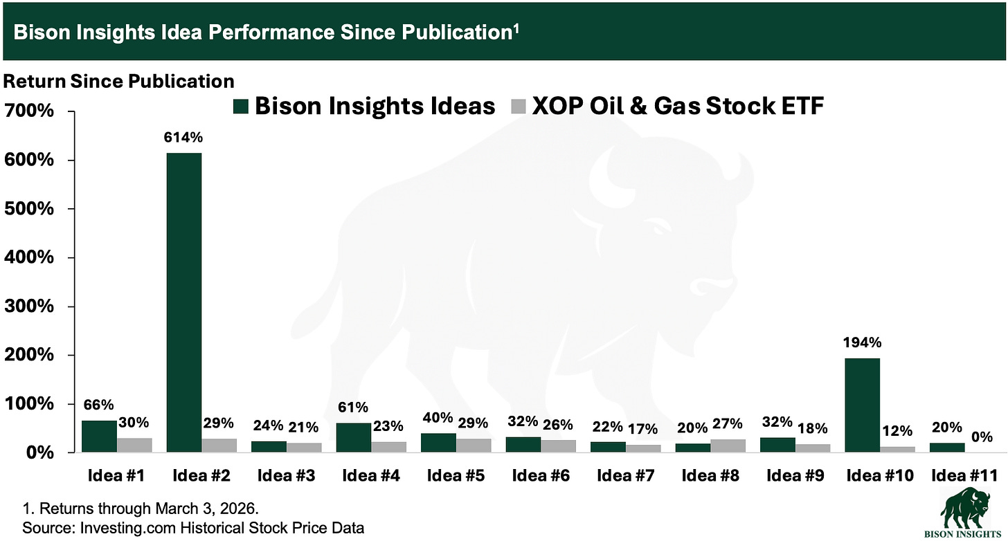 This backdrop creates a compelling setup for the several Bison Insights ideas I’ve shared with high oil price leverage, including the most recent idea that I shared yesterday. Most of these companies are overlooked, undervalued names that receive little to no coverage elsewhere. Although these positions have already outperformed, I think there is still significant upside: