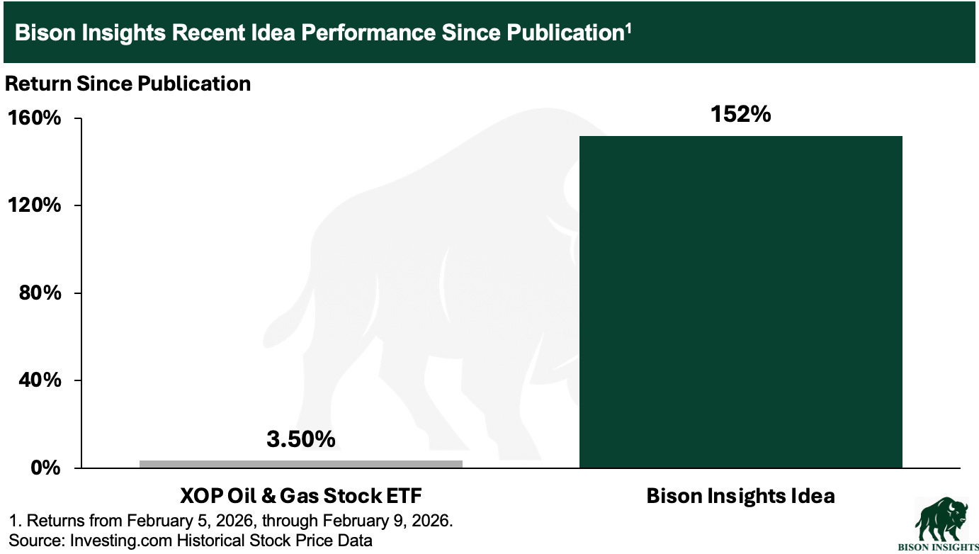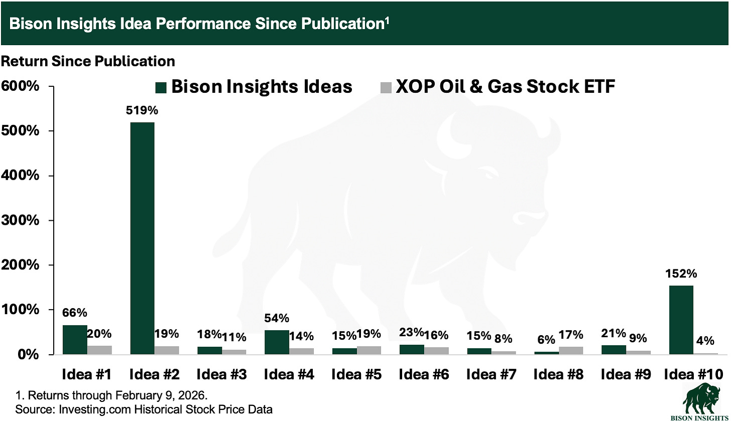 This latest result improves the already stellar outperformance of the oil and gas investment ideas I’ve shared since launching Bison Insights back in August: