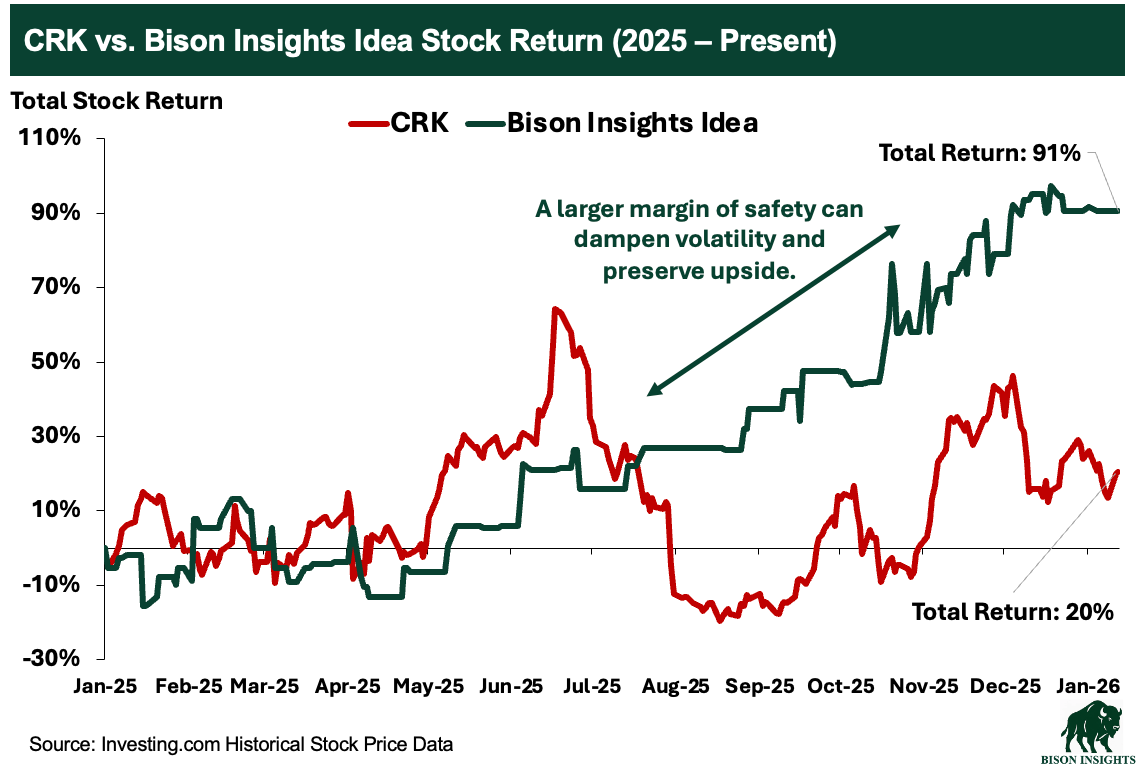 A good illustration of this can be seen in the performance of Comstock Resources (CRK), one of the more richly valued gas producers today. Compared with the natural gas stock I wrote about in The Deep Value, High Performing Natural Gas Play That The Market Has Overlooked, which trades at a much lower valuation, CRK has experienced far greater volatility over the past year, in response to gas price swings and shifts in market narratives. The stock I highlighted, with its much larger margin of safety, has been far less sensitive to those swings, and has moved steadily higher: