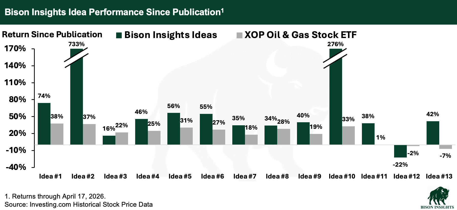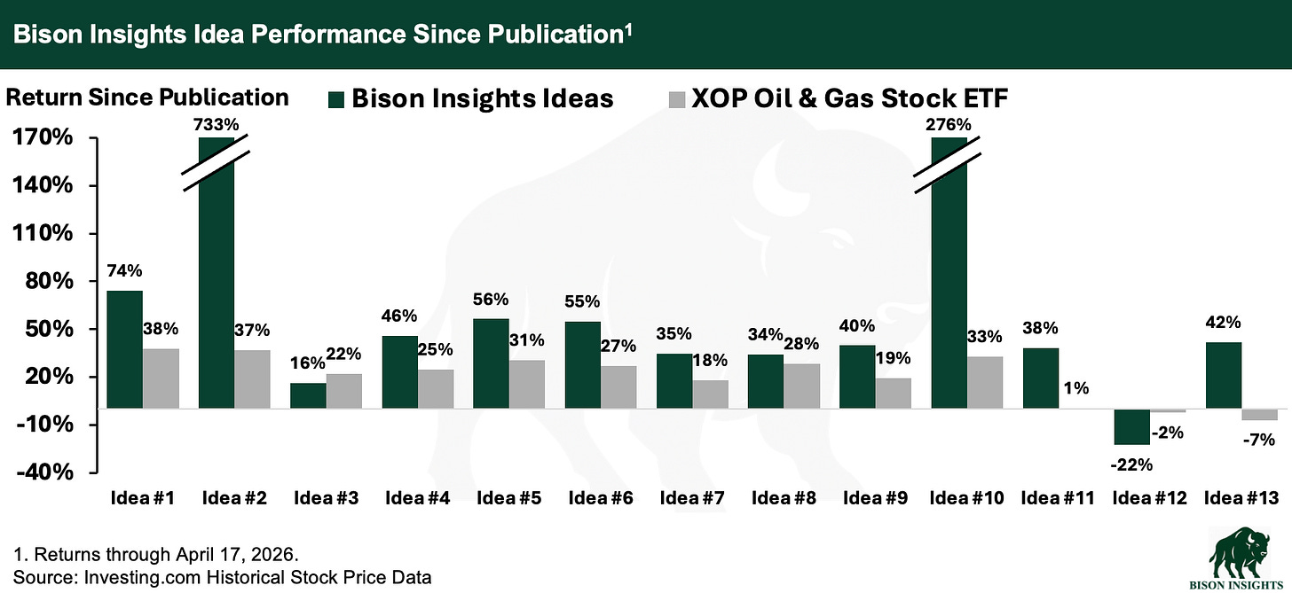 This stock is one of my largest investment holdings and is a new idea here on Bison Insights. Even after the recent pullback in oil equities, other Bison Insights ideas have continued to largely outperform the broader energy market, as they were before the war too: