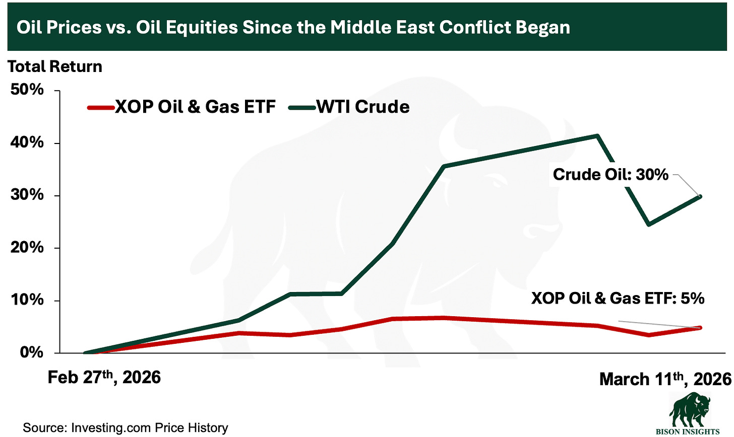 Since the outbreak of war in the Middle East and Iran’s declaration that the Strait of Hormuz is closed, oil prices have surged while energy equities have lagged the rally:
