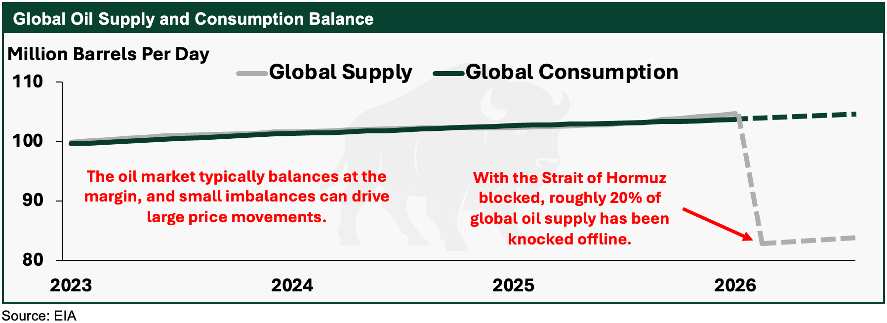 This lag suggests that equities are not yet fully pricing in the increase in oil prices. Meanwhile, oil itself is trading with extreme volatility as the market constantly reprices how long the Strait may remain closed and how large the resulting supply shortfall may be. In a market that clears at the margin, even a temporary disruption of this size can cause very large price swings: