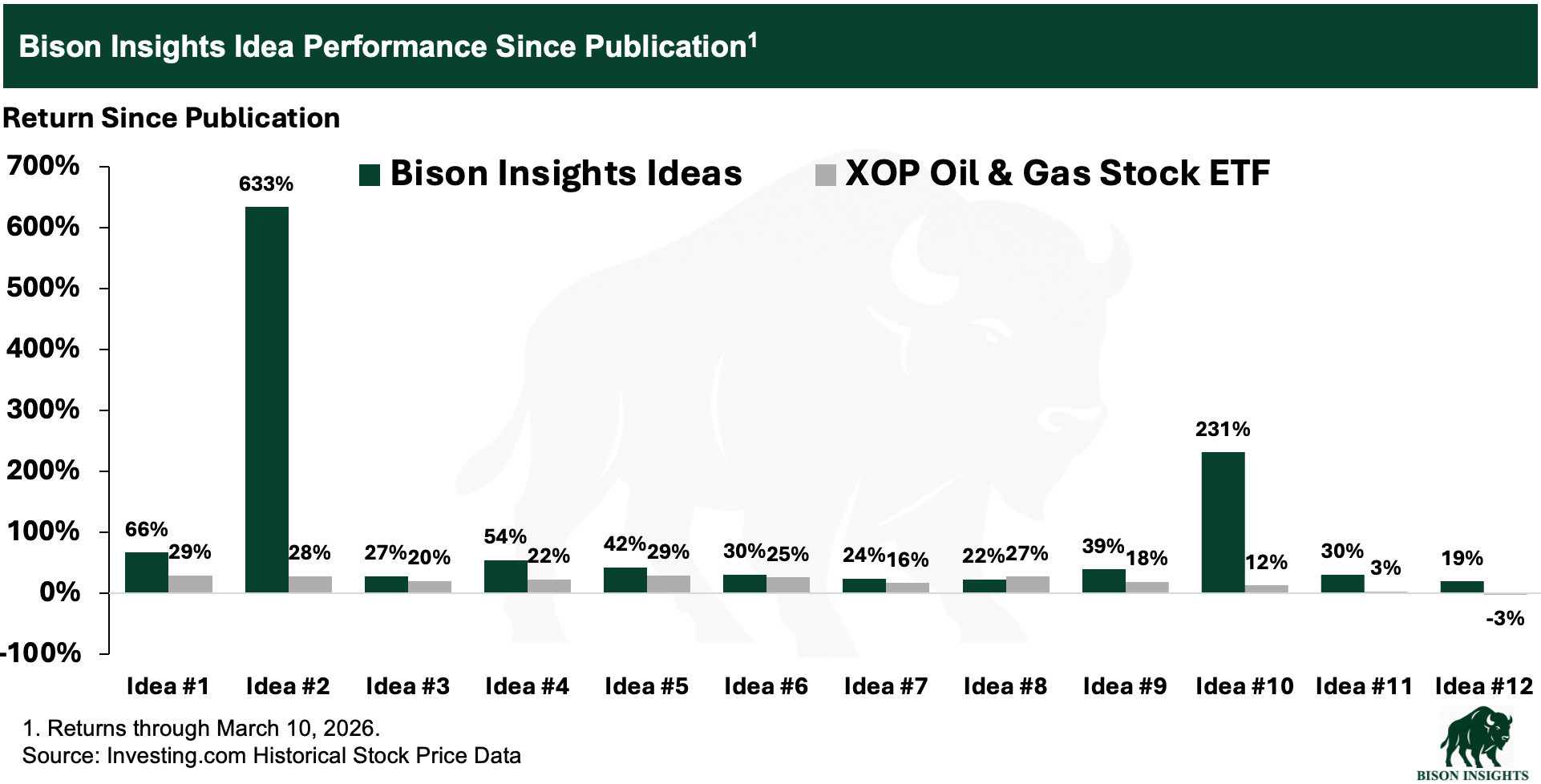 Since launching Bison Insights, the twelve investment ideas I’ve published have performed very well both in absolute terms and relative to the broader energy index: